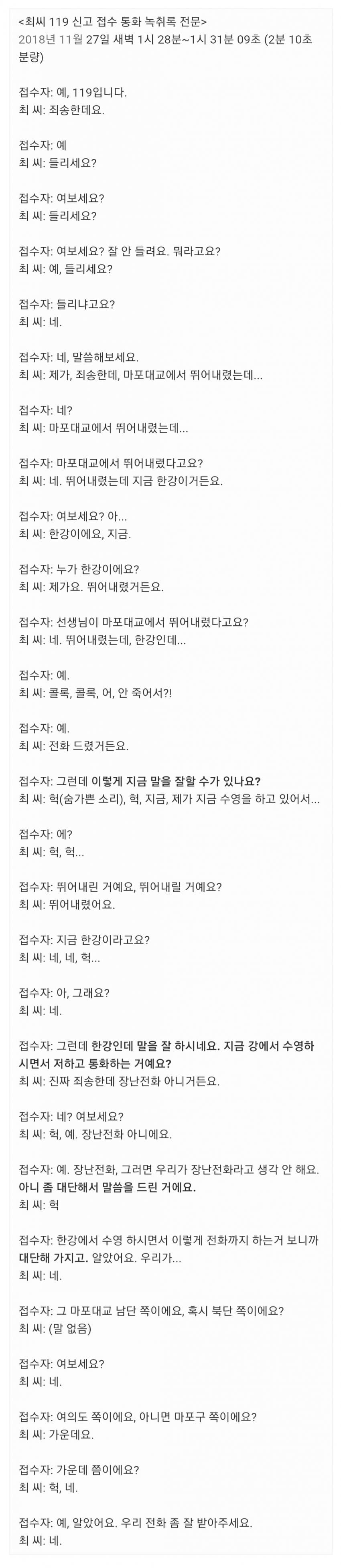 허우적거리면서 겨우 버티다 본인이 119에 구조요청을함